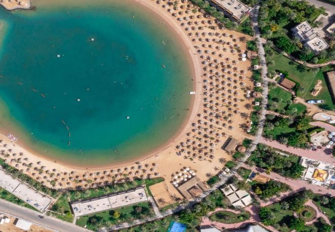 Desert Rose 5* разполага със собствен девствен пясъчен плаж с дължина от 1км, с 40 000 м² природна лагуна със златист пясък. Хотелът предлага на своите клиенти идеална атмосфера за забавления или просто да се насладят на прекрасния ненадминат климат на Червено море. Хотелът разполага с 4 плувни басейна, 1 с олимпийски размери, голям плувен басейн с палуби за слънчеви бани и бар край него, отопляем семеен плувен басейн и детски плувен басейн, специализиран за бебета и малки деца със собствен мини душ и мини столове. Като допълнение Аквапаркът предлага още и 6 водни пързалки.