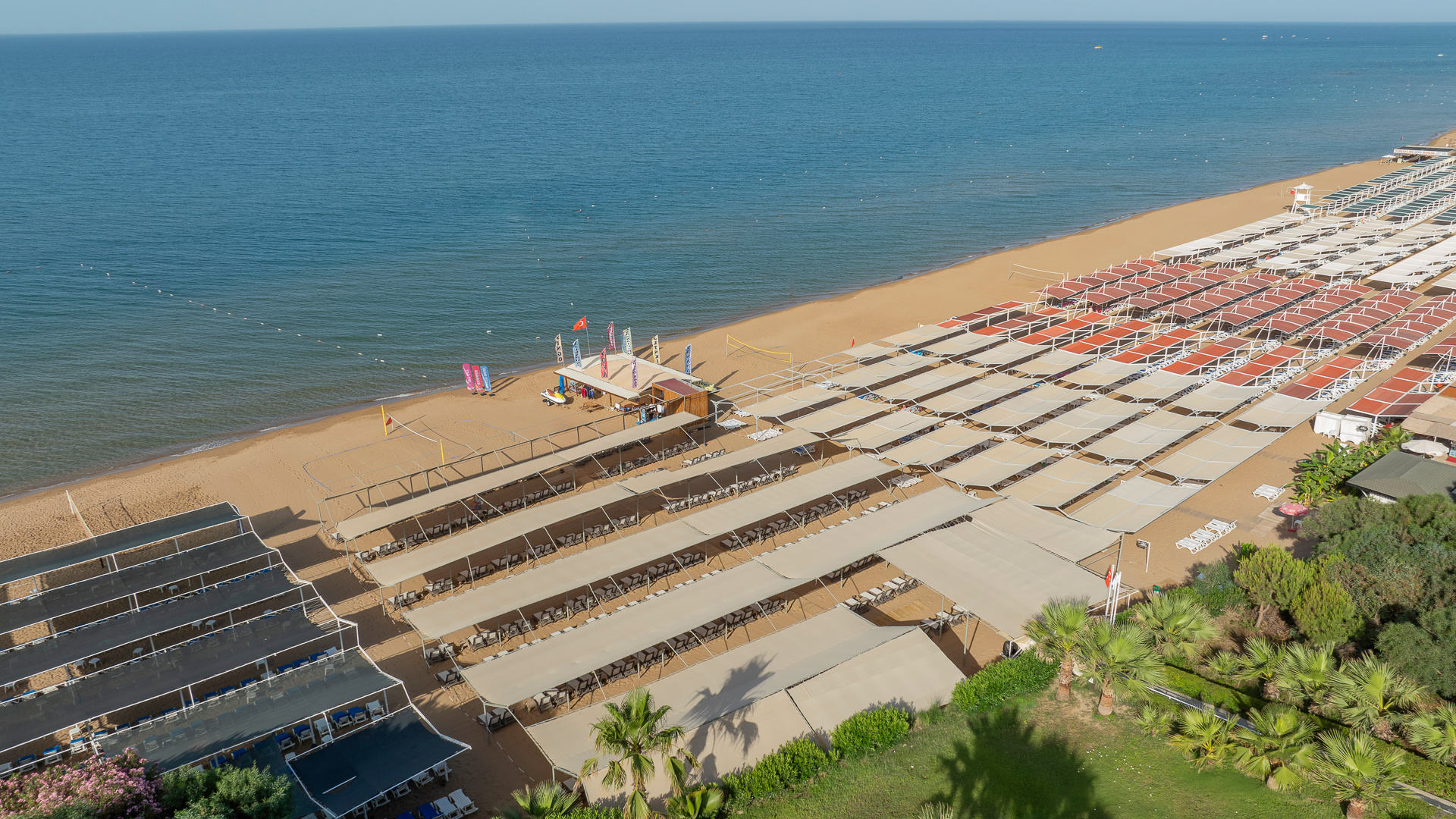 Собствен, на 500 м. от хотела, пясъчен. Безплатен шатъл до плажа (в определен часови диапазон). Чадъри, шезлонги и плажни кърпи на плажа и при басейна – безплатно.